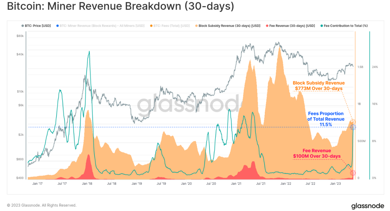Nos últimos meses, o preço do BTC tem apresentado oscilações entre US$ 26 mil e US$ 30 mil. Durante esse período, os mineradores tiveram um faturamento total de US$ 773 milhões com o subsídio por bloco de 6,25 BTC. Além disso, devido ao aumento da pressão das taxas, os mineradores conseguiram gerar uma receita adicional de US$ 100 milhões.