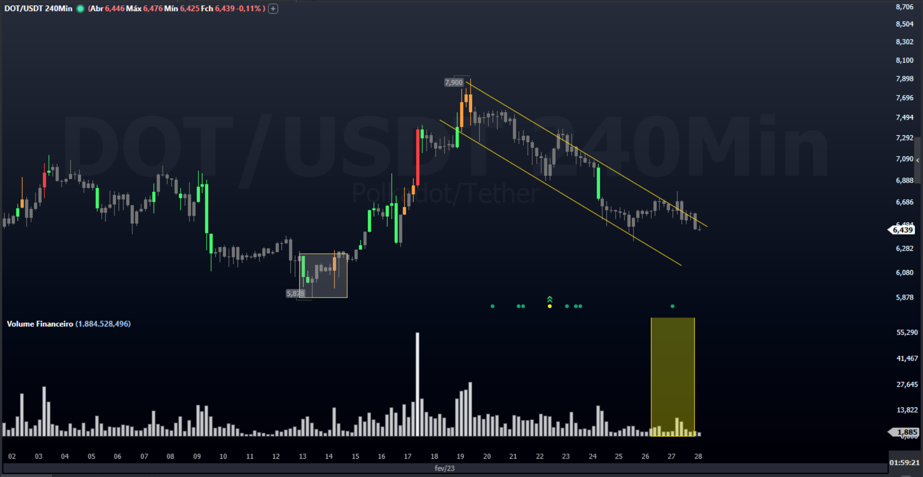 Analisando o gráfico de 4H da Polkadot, observa-se que houve a formação de um pivô de alta com bastante volume, o que ocasionou no rompimento para cima da consolidação que havia sido formada nos últimos 10 dias.