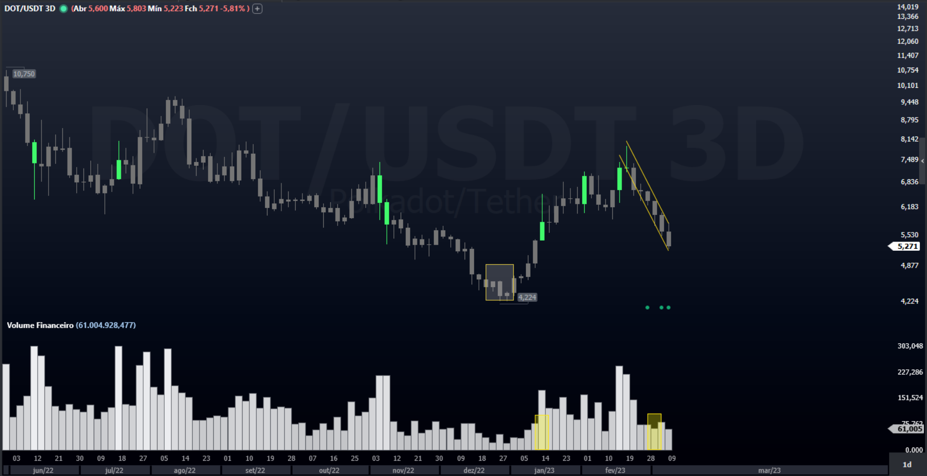 Caso entre bastante volume comprador revertendo este movimento, e iniciando uma alta para romper os US$6,05, os próximos alvos da DOT serão as regiões de liquidez dos US$6,32 e US$6,64.