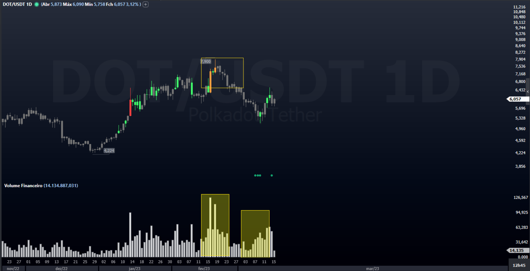 No momento em que a DOT atingiu essa resistência, houve muito volume vendedor, o que era esperado. Esse volume de vendas acabou trazendo uma desvalorização de -8%